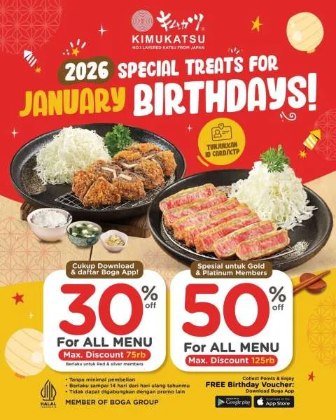 Selain itu, Kimukatsu juga ada promo Januari Birthdays, spesial untuk Anda yang sedang berulang tahun. Melalui promo ini, Anda bisa dapat diskon sampai 50% lo.