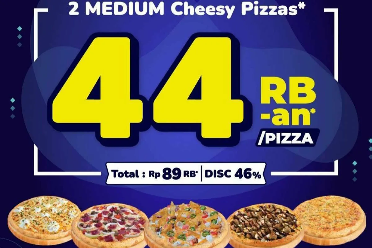 Dengan berlakunya diskon sebesar 46%, maka per 1 loyang Medium Cheesy Pizzanya bisa dibanderol dengan harga Rp 44.000-an.