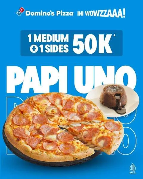Selain itu, di Domino's Pizza juga ada promo Papi Uno dengan Pizza lezat dan hematnya. Modal Rp 50.000 saja sudah dapat Pizza spesial yang bikin happy.