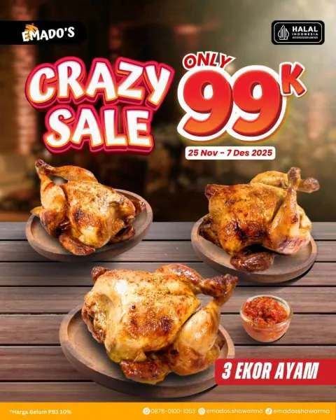 MOMSMONEY.ID - Nikmati promo Crazy Sale dari Emado's dengan paket tiga ekor ayam hanya Rp 99.000. Promonya terbatas cuma sampai 7 Desember 2025 saja, lo.