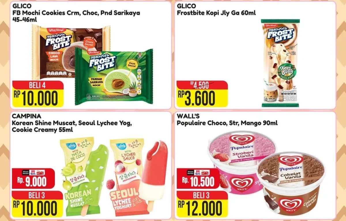 Promo ini menawarkan Harga Spesial dan Beli Banyak Lebih Hemat untuk berbagai merek es krim seperti Campina, Joyday, Wall’s, hingga Glico.