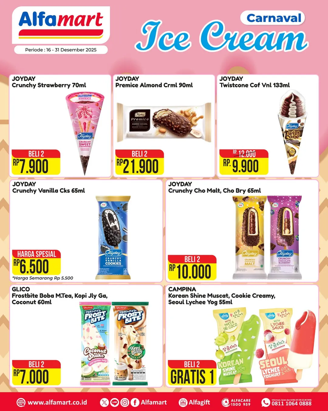 Sampai tanggal 31 Desember 2025, ada promo Carnaval Ice Cream di Alfamart yang dapat Anda nikmati.