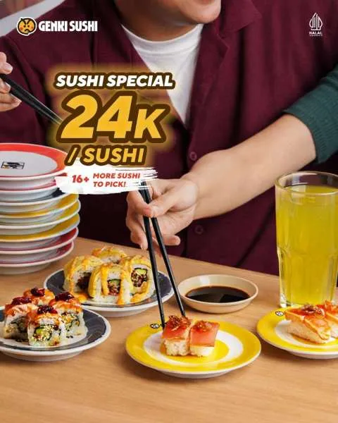 Selain itu, buat Anda pecinta Sushi, datang ke Genki Sushi adalah surganya. Ada promo Sushi dengan 16 pilihan Sushi favorit yang hemat banget. Cocok banget untuk Anda yang ingin makan Sushi sampai puas tanpa khawatir urusan dompet.