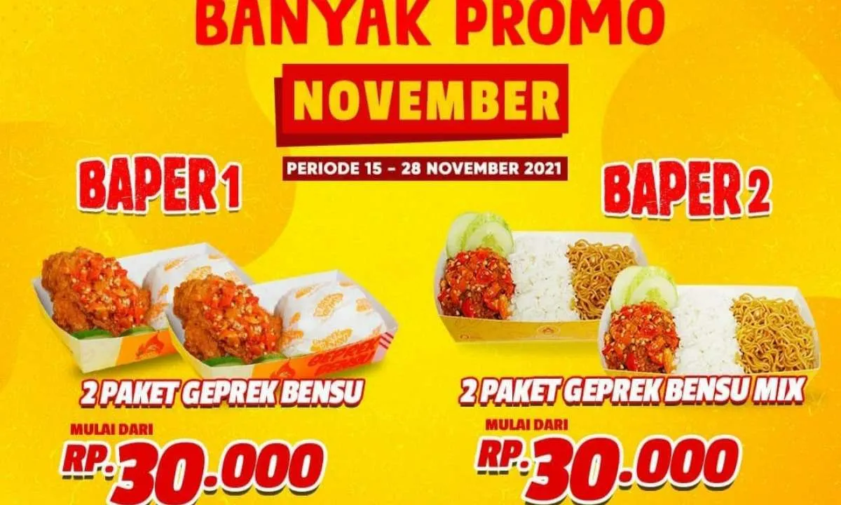 Promo Geprek Bensu Paket Baper berlaku di seluruh Indonesia selama periode 15-28 November 2021.