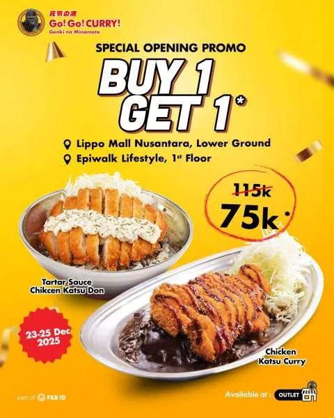 Selain itu, Go!Go!Curry juga ada promo New Opening Store Epiwalk Mall & Lippo Mall Nusantara dengan penawaran Buy 1 Get 1 lo. Anda bisa menikmati promo ini selama tiga hari saja.