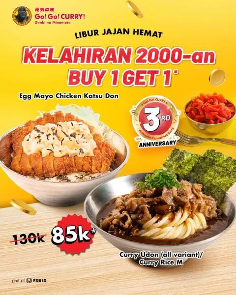 Go!Go!Curry mau traktir Anda yang kelahiran 2000-an nih. Anda bisa makan bareng bestie untuk menikmati Curry Udon atau Curry Rice dan Egg Mayo Chicken Katsu Don hanya sekali bayar saja.