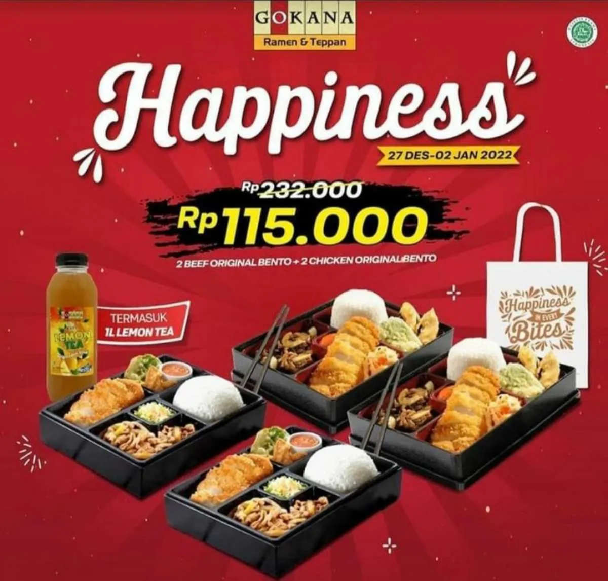 Melansir Instagram Gokana di @Gokanaresto, promo bertajuk “Happiness” ini menawarkan diskon besar-besaran untuk 2 paket pilihan versi jumbo yang terdiri atas masing-masing 4 makanan dan 1 minuman!