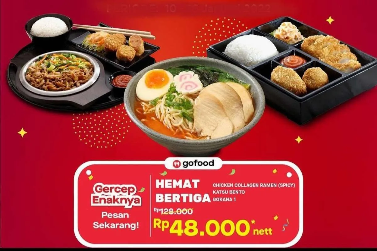 Melansir dari Instagram @gokanaresto, Gokana menawarkan Paket Hemat Bertiga yang menghadirkan 3 menu jumbo pilihan dengan harga hanya Rp 48.000 nett, tanpa tambahan pajak.