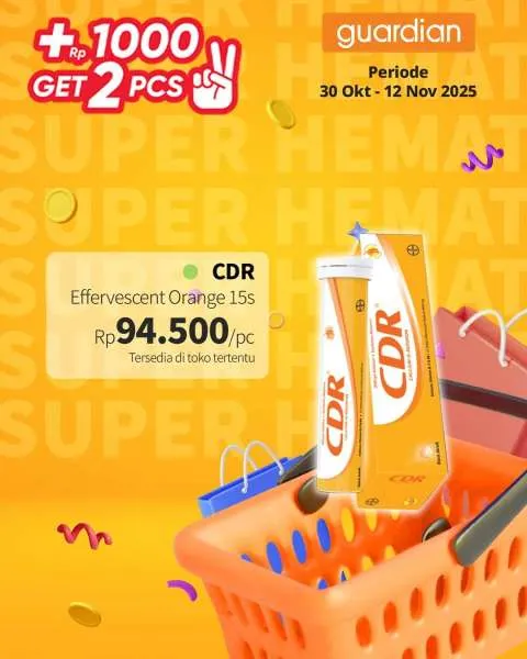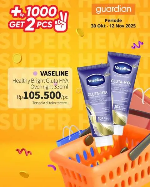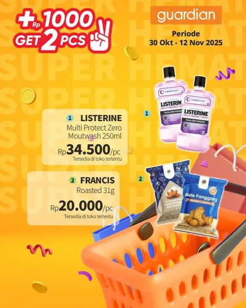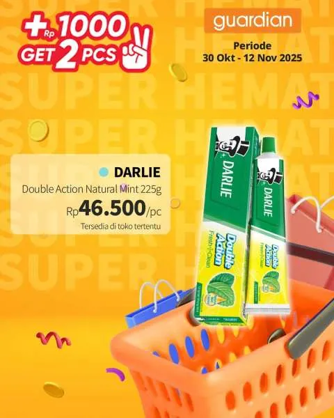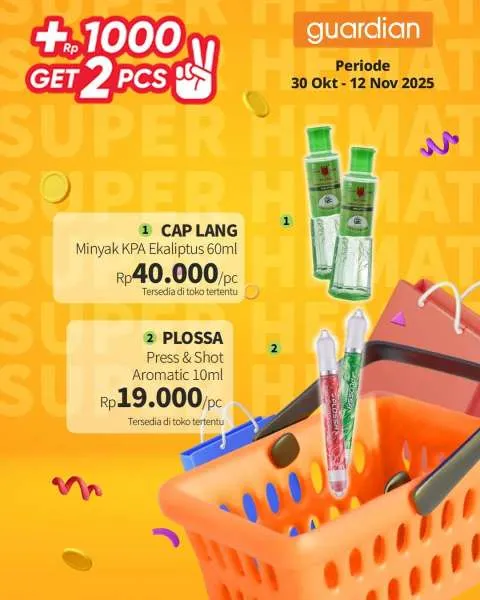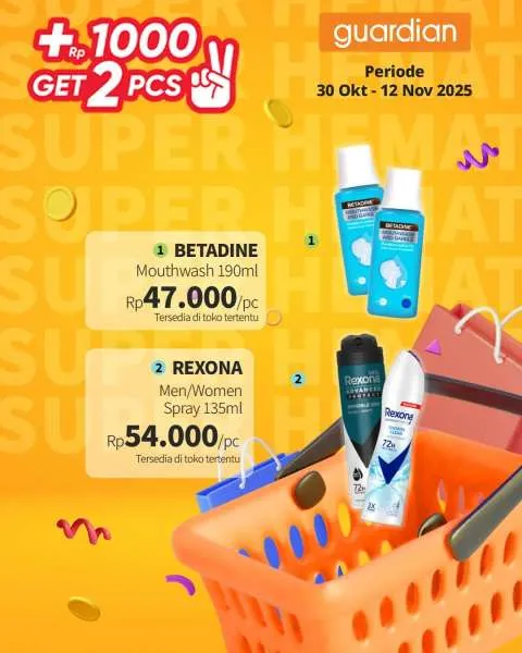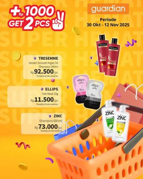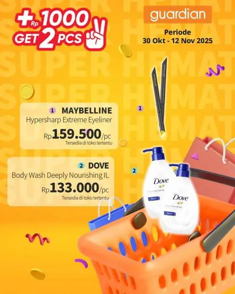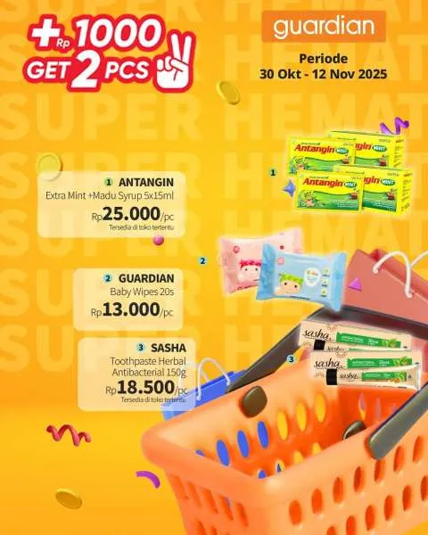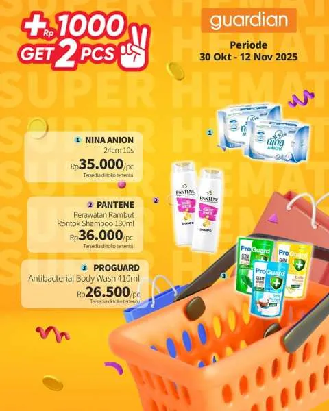 Kali ini, ada promo Guardian Super Hemat. Berlaku 1-12 November 2025, penawaran menarik dari promo Guardian Super Hemat adalah Anda berhak mendapatkan 2 buah produk apabila menambahkan uang Rp 1.000.