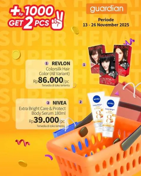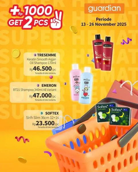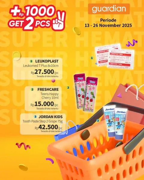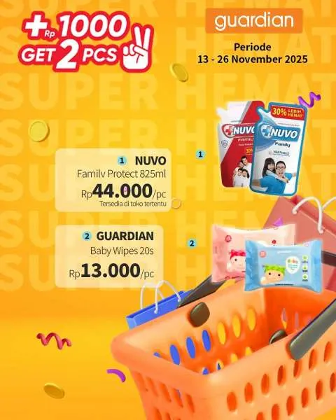 Kali ini, ada promo Guardian Super Hemat. Berlaku 13-26 November 2025, penawaran menarik dari promo Guardian Super Hemat adalah Anda berhak mendapatkan 2 buah produk apabila menambahkan uang Rp 1.000.