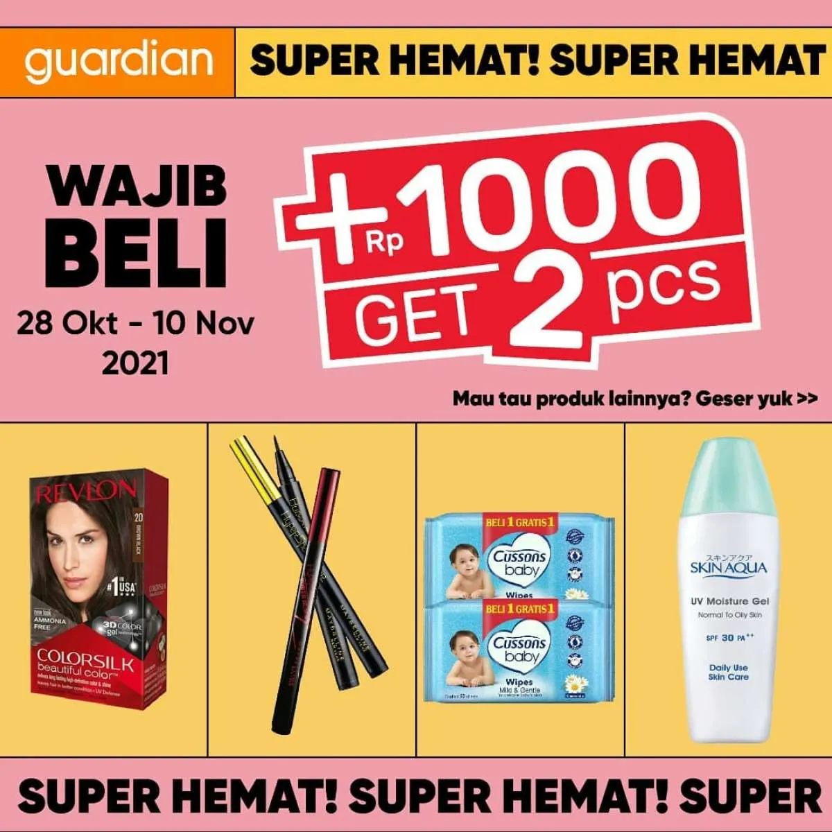 Berlaku 28 Oktober-10 November 2021, penawaran menarik dari promo Guardian Super Hemat ini yaitu +Rp 1000 Get 2 pcs atau Anda berhak mendapatkan 2 buah produk apabila menambahkan uang Rp 1000.
