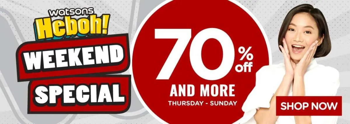 Promo Watsons Heboh! Weekend Special menawarkan Diskon s/d 70% untuk berbagai produk skincare, makeup, hingga personal care yang bisa Anda nikmati weekend ini.
