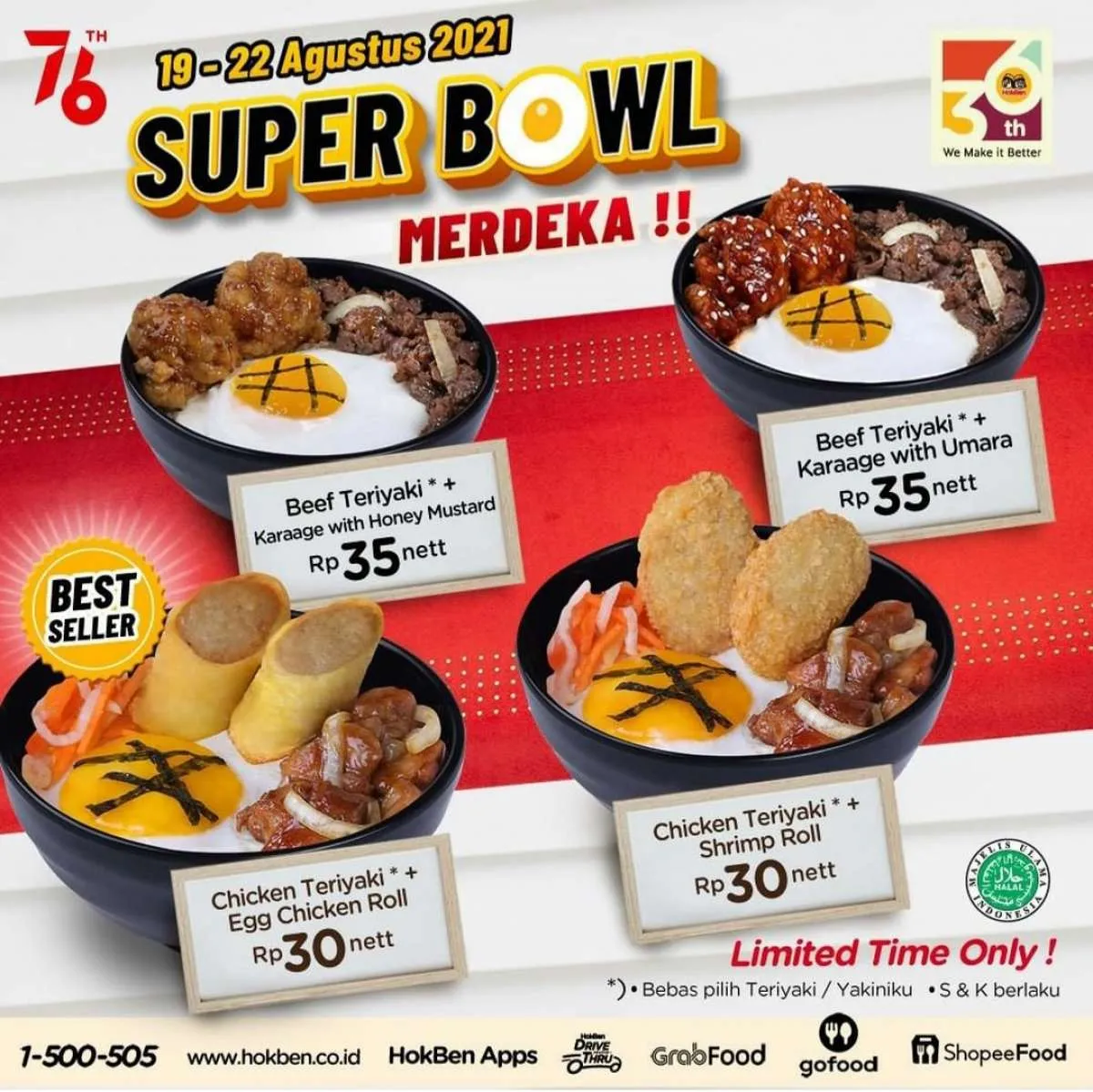 Mengutip dari Instagram @HokBen_id, promo Super Bowl Merdeka ini menawarkan menu-menu promo kece pilihan untuk anda semua hanya dengan harga 30.000-an saja.