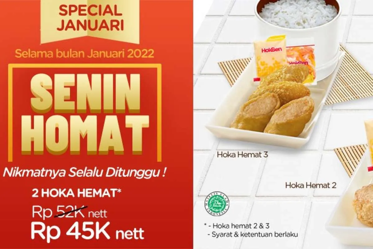 Menu Paket Senin Homat itu sendiri merupakan promo hemat dari Hokben yang khusus diadakan setiap hari Senin saja. Promo ini mengeluarkan diskon menu makanan yang selalu berbeda di setiap bulannya.