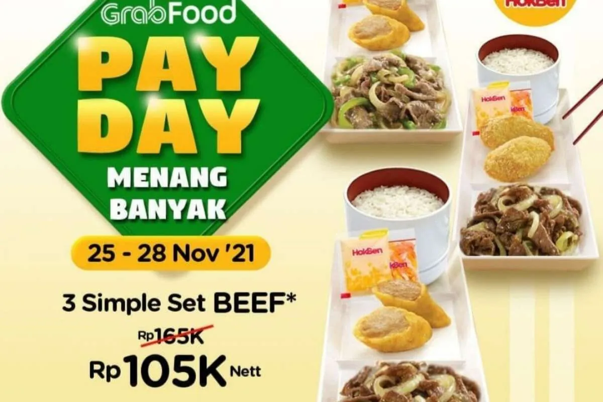 Promo ini bernama Payday GrabFood. Payday GrabFood adalah promo kolaborasi Hokben bersama GrabFood & OVO.