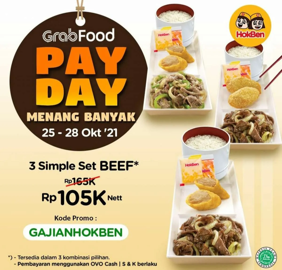 Promo ini bernama Payday GrabFood. Payday GrabFood adalah promo kolaborasi Hokben bersama GrabFood & OVO.