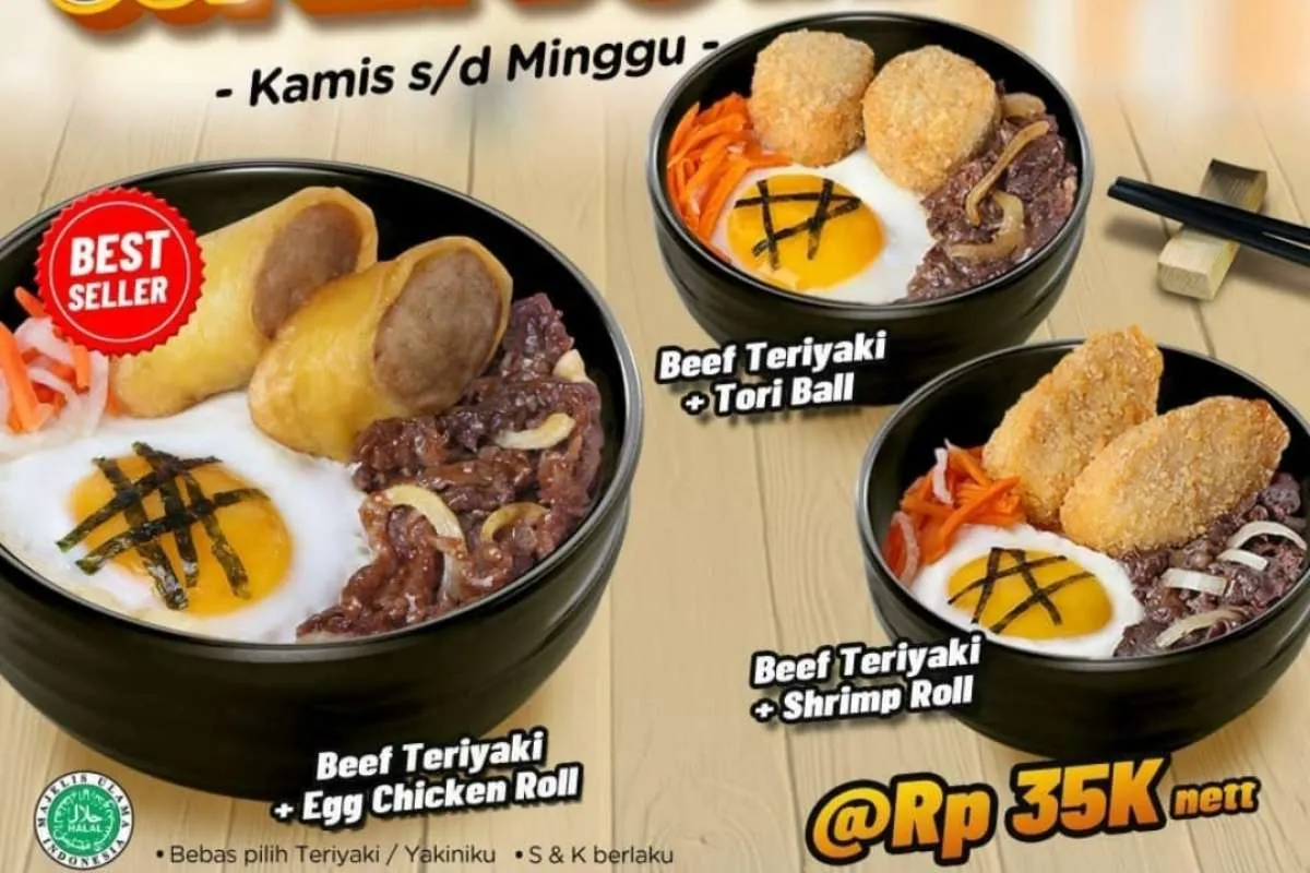 - Beef Teriyaki + Egg Chicken Roll, harga Rp 35.000 nett