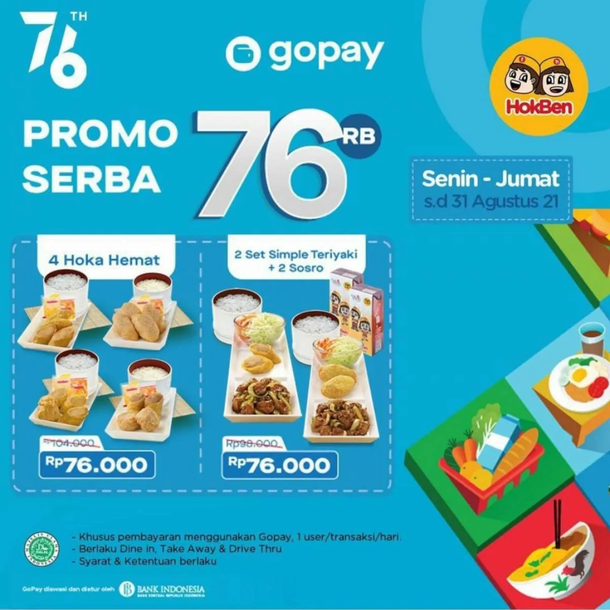 Menu-menu pada Promo Serba Rp 76.000 di HokBen ini bisa hanya bisa anda dapatkan jika pembayarannya melalui Take Away, Drive Thru, dan Dine In* menggunakan Gopay, dan bukan pemesanan lewat Gofood.