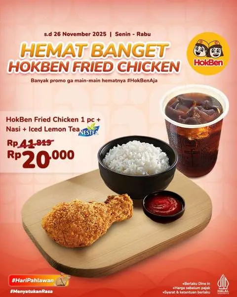 Selain itu, di HokBen juga ada promo spesial lainnya yang bisa Anda nikmati tiap Senin-Rabu selama November 2025. Ada promo Hemat Banget HokBen Fried Chicken dengan paket Ayam Goreng, nasi, dan minuman segar hanya Rp 20.000.