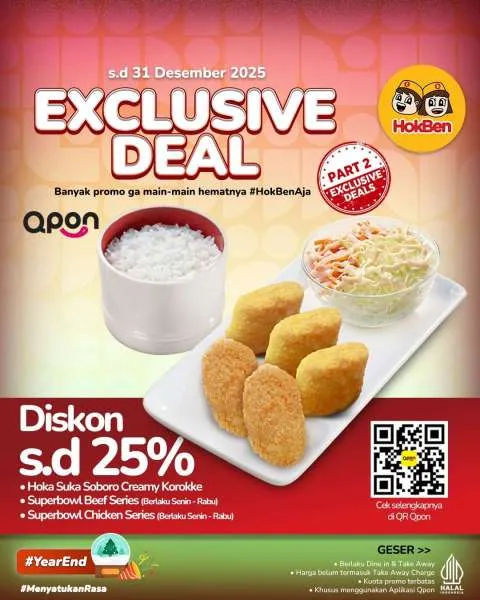 Promo bisa Anda nikmati sampai 31 Desember 2025 di seluruh HokBen, kecuali regional Bandung.