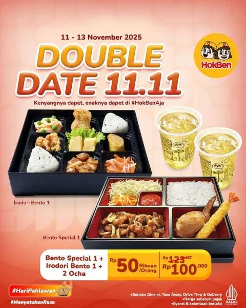 Momen 11.11 menghadirkan beragam promo kuliner yang tidak boleh Anda lewatkan begitu saja. Salah satunya di HokBen yang menyediakan paket makan berdua dengan menu Bento yang dijamin bikin puas dan aman di kantong.