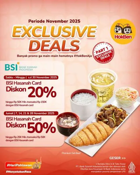 Selain itu, ada juga promo spesialnya dari HokBen, khusus untuk Anda pengguna BSI. Dapatkan diskon sampai 50% untuk menikmati menu favorit di HokBen.