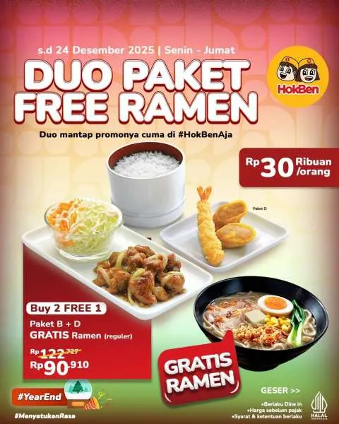 MOMSMONEY.ID - Makan di HokBen bisa dapat gratis Ramen? Iya, bisa. Ada promo HokBen Duo Paket Free Ramen yang bisa Anda nikmati tiap Senin-Jumat selama Desember 2025 mulai Rp 30.000-an saja per orang.