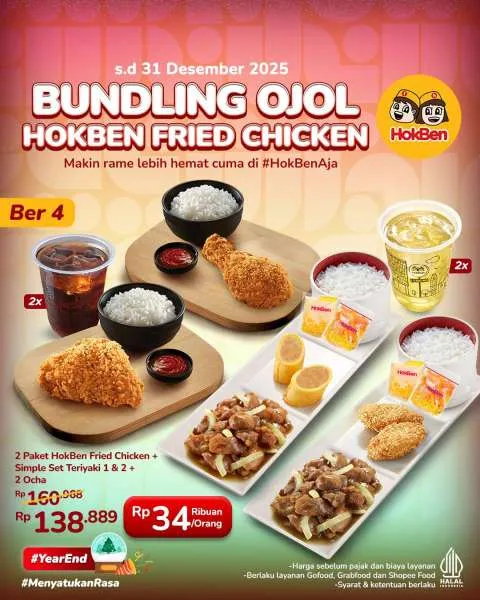 - Paket berempat (Rp 138.889): 2 Paket HokBen Fried Chicken + Simple Set Teriyaki 1 & 2 + 2 Ocha