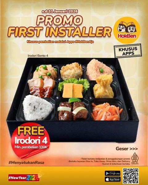 Dikutip dari Instagram @hokben_id, Anda bisa mendapatkan 1 Irodori Bento 4 gratis dengan minimal pembelian Rp 100.000, khusus untuk Anda yang menggunakan aplikasi HokBenAja pertama kalinya.