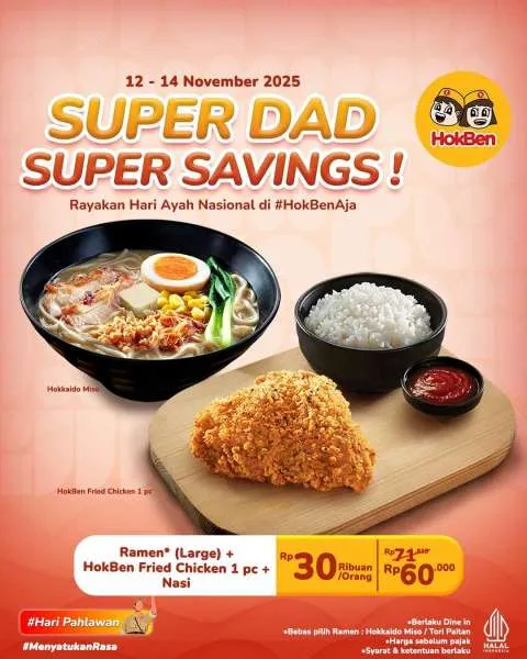 MOMSMONEY.ID - Rayakan momen Hari Ayah Nasional dengan promo HokBen bertajuk Super Dad Super Savings. Anda bisa menikmati paket makan berdua hemat hanya Rp 30.000-an per orang mulai 12-14 November 2025.