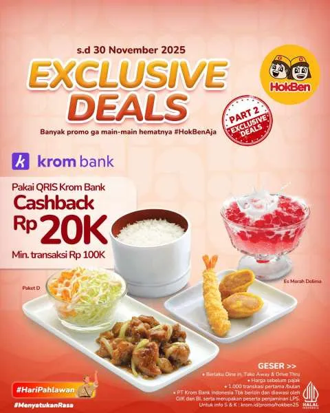 Selain itu, Anda juga bisa menikmati promo HokBen dengan Krom Bank selama November 2025 lo. Ada cashback spesial yang bisa Anda dapatkan jika makan di Hokben.