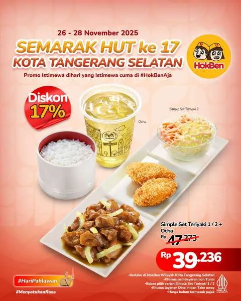 Selain itu, khusus bagi warga Tangerang, ada promo spesial dari HokBen untuk merayakan HUT ke-17 Kota Tangerang Selatan. Anda bisa menikmati menu spesial HokBen dengan diskon 17% lo.