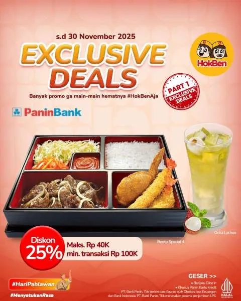Selain itu, Anda juga bisa menikmati promo Exclusive Deals di Hokben, khusus pengguna Panin Bank. Ada diskon sampai 25% yang bisa Anda dapatkan kalau jajan di HokBen lo.