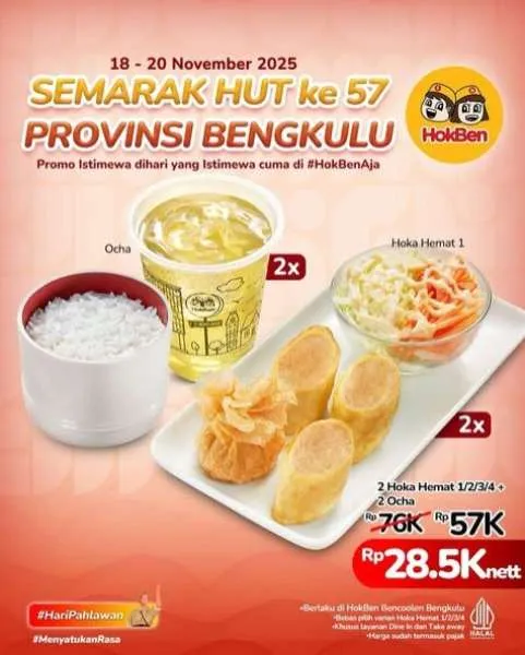 Untuk merayakan HUT ke-57 Provinsi Bengkulu, HokBen ada promo spesial dari 18-20 November 2025. Anda bisa menikmati Hoka Hemat berdua hanya Rp 28.000-an saja per orang.