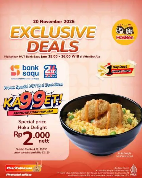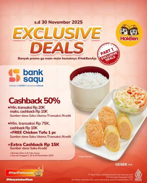 Selain itu, Anda juga bisa menikmati promo HokBen dengan Bank Saqu yang berlaku sepanjang November 2025. Ada cashback sampai 50% yang bisa Anda dapatkan lo.