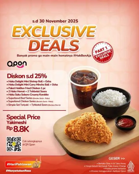 Selain itu, Ada juga promo HokBen dengan Qpon selama November 2025. Anda bisa menikmati diskon sampai 25% dan harga spesial hanya Rp 8.800 saja.
