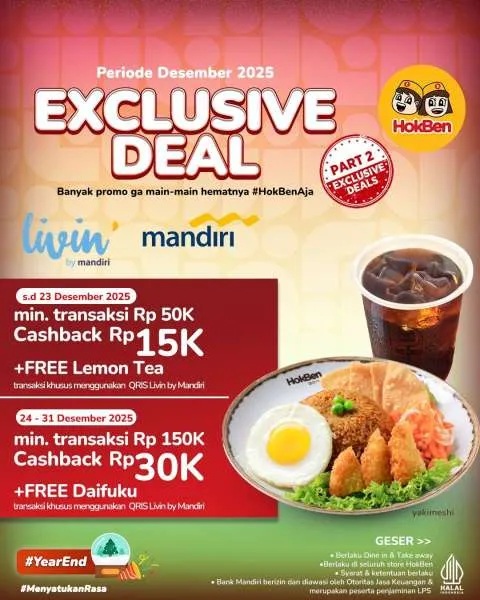 Selain itu, Anda juga masih punya kesempatan untuk menikmati promo Exclusive Deals di HokBen, khusus pengguna Livin' by Mandiri. Ada cashback spesial yang bisa Anda dapatkan untuk makan enak di HokBen.
