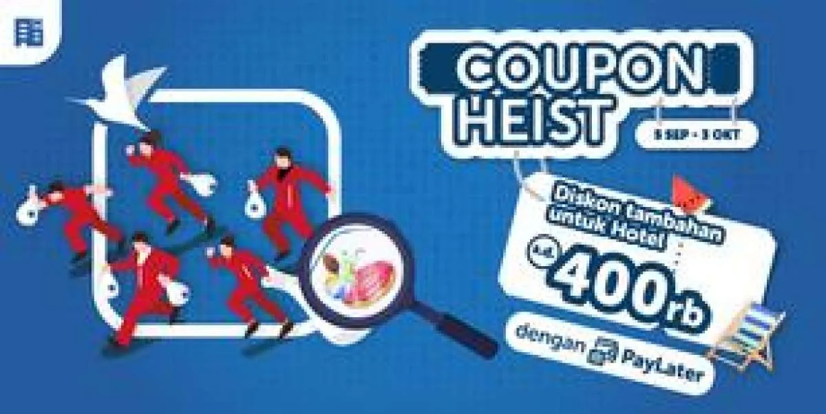 Yuk, ikut rayakan bulan Coupon Heist bareng PayLater! Nikmati tambahan diskon hotel tanpa minimum transaksi hingga Rp400.000 untuk menginap ke mana pun anda perlu. Periode promo ini berlangsung dari tanggal 5 September s.d 3 Oktober 2021. Tentunya, kupon ini bisa digunakan kapan saja, moms.