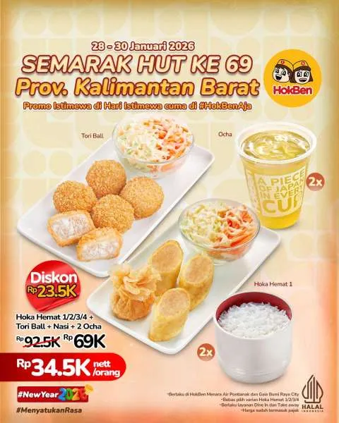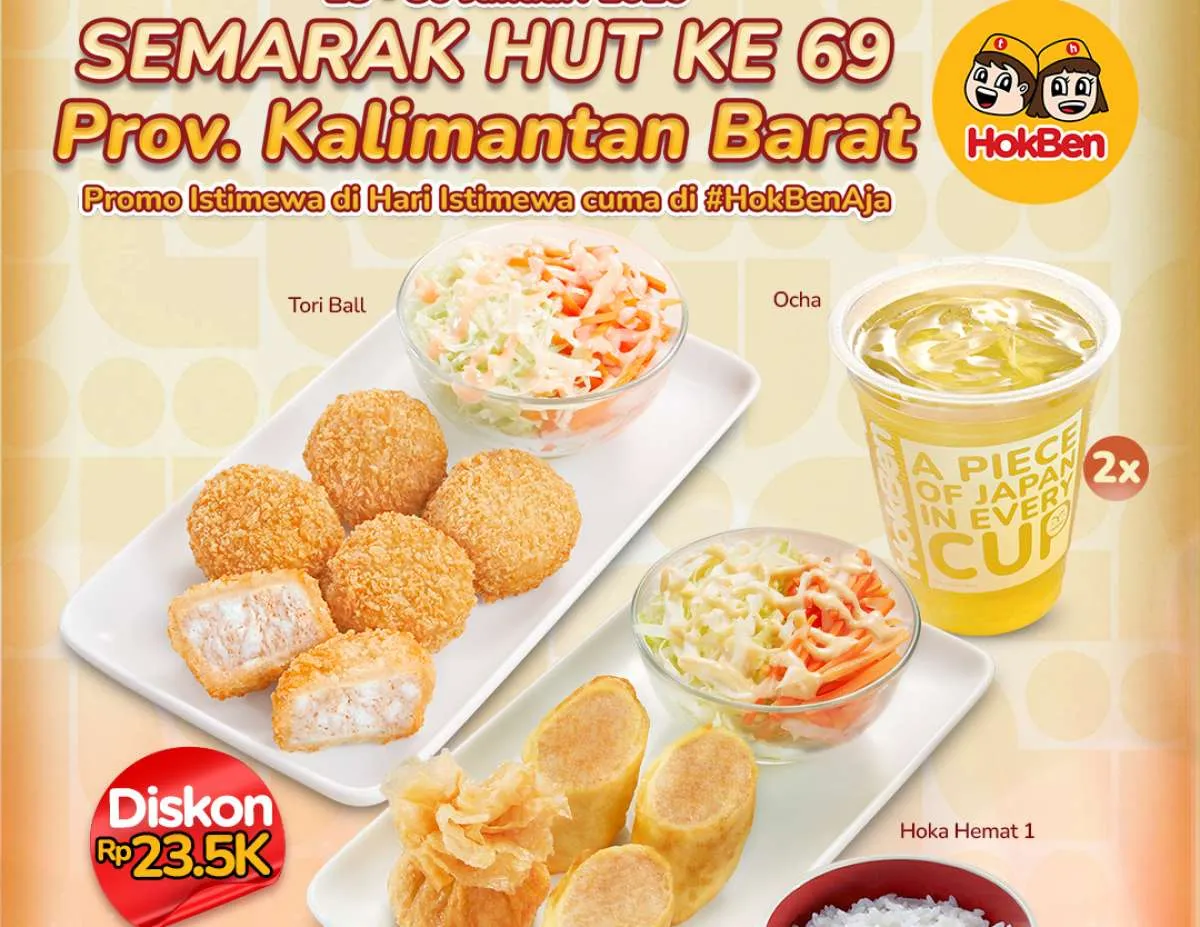 MOMSMONEY.ID - Dalam rangka memeriahkan HUT ke-69 Kalimantan Barat, HokBen menghadirkan promo spesial yang berlangsung tiga hari saja. Nikmati paket makan berdua hemat dengan diskon hingga Rp 23.000-an.