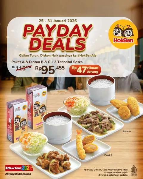 Selain itu, Anda juga masih bisa menikmati promo Payday Deals di HokBen. Ada paket makan berdua dengan menu spesialnya yang hemat banget.