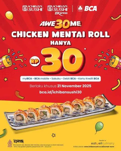 MOMSMONEY.ID - Nikmati promo HUT ke-30 Ichiban Sushi dengan menu spesialnya berupa Chicken Mentai Roll hanya Rp 30. Promo berlaku cuma di tanggal 21 November 2025.