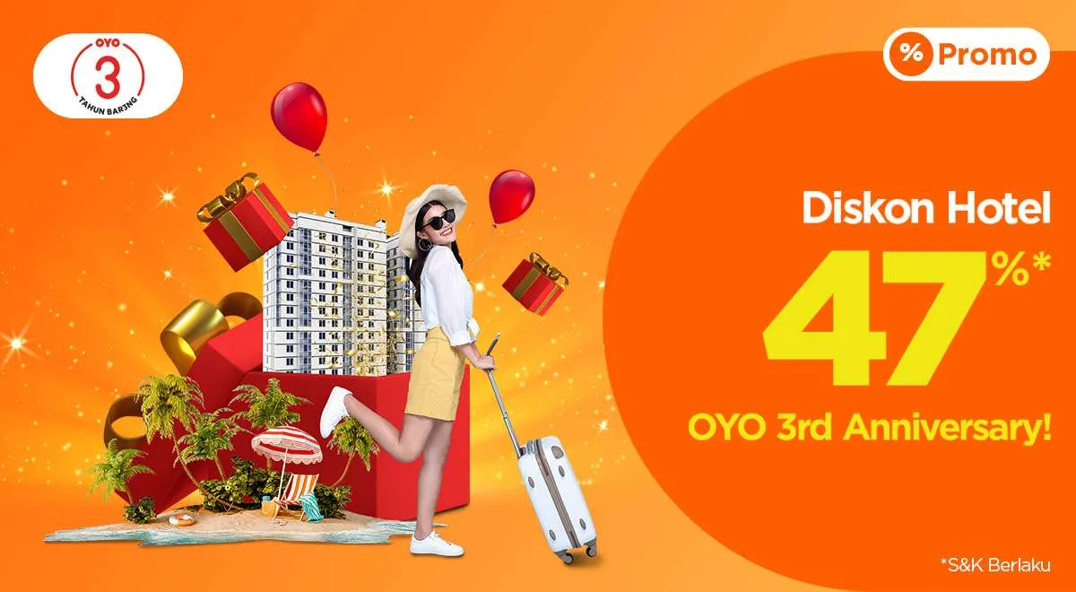 MOMSMONEY.ID - Promo HUT OYO ke-3, Anda bisa menikmati potongan langsung sebesar 47% untuk menginap lebih hemat di hotel-hotel OYO. Bisa menginap lebih lama, dengan budget yang sama!