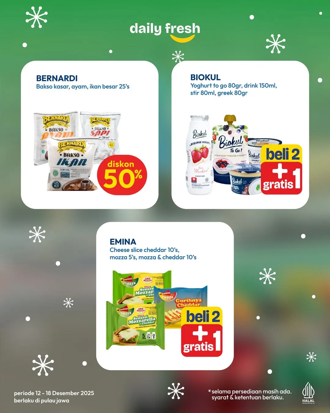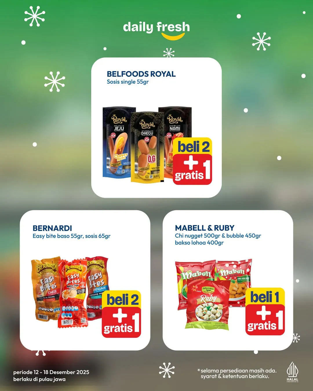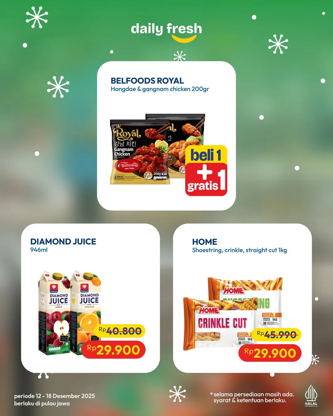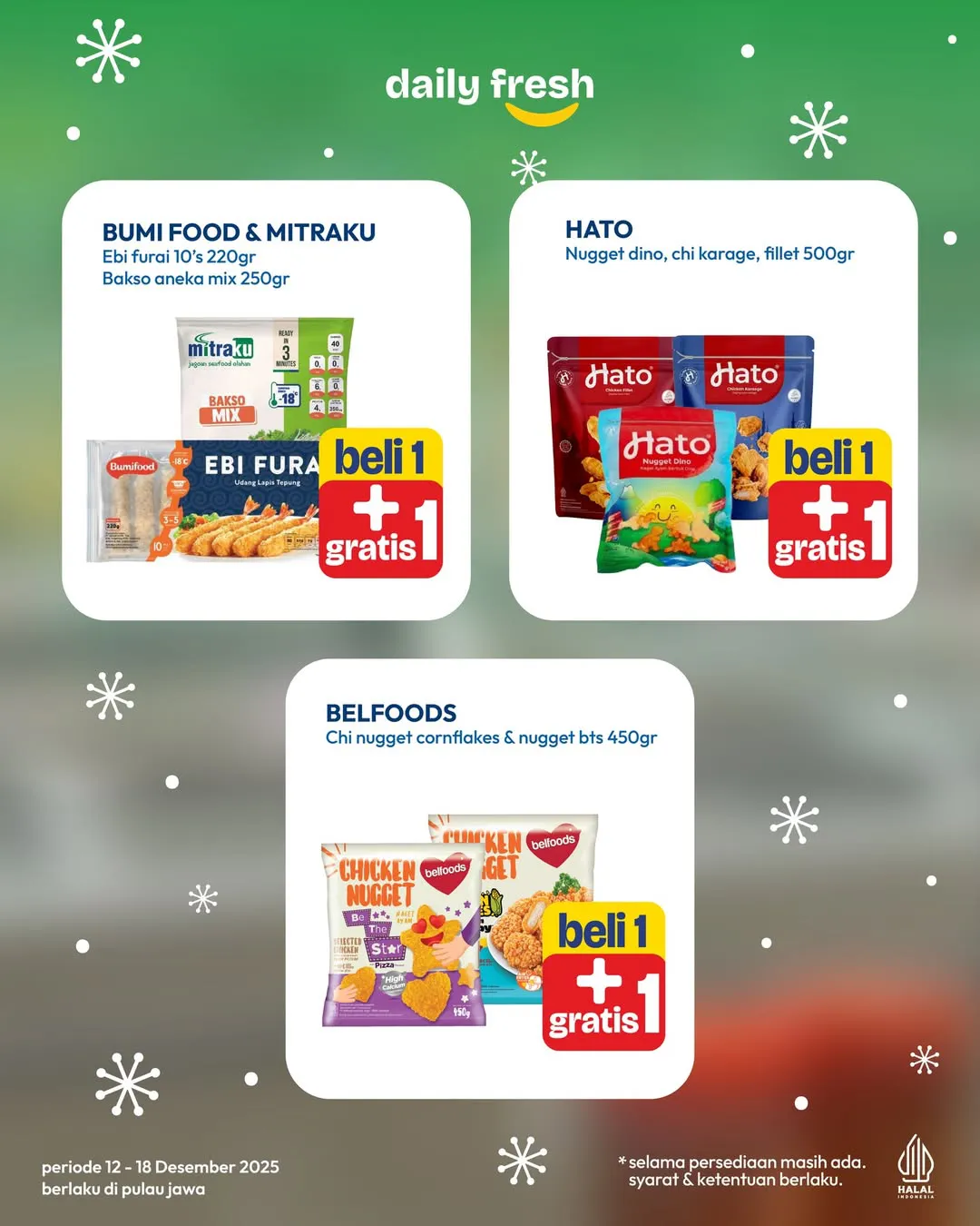 Selama 12-18 Desember 2025, Hypermart mengadakan promo Buy 1 Get 1. Promo ini menawarkan Beli 1 Gratis 1 dan Beli 2 Gratis 1 untuk berbagai produk mulai dari frozen food hingga minuman.