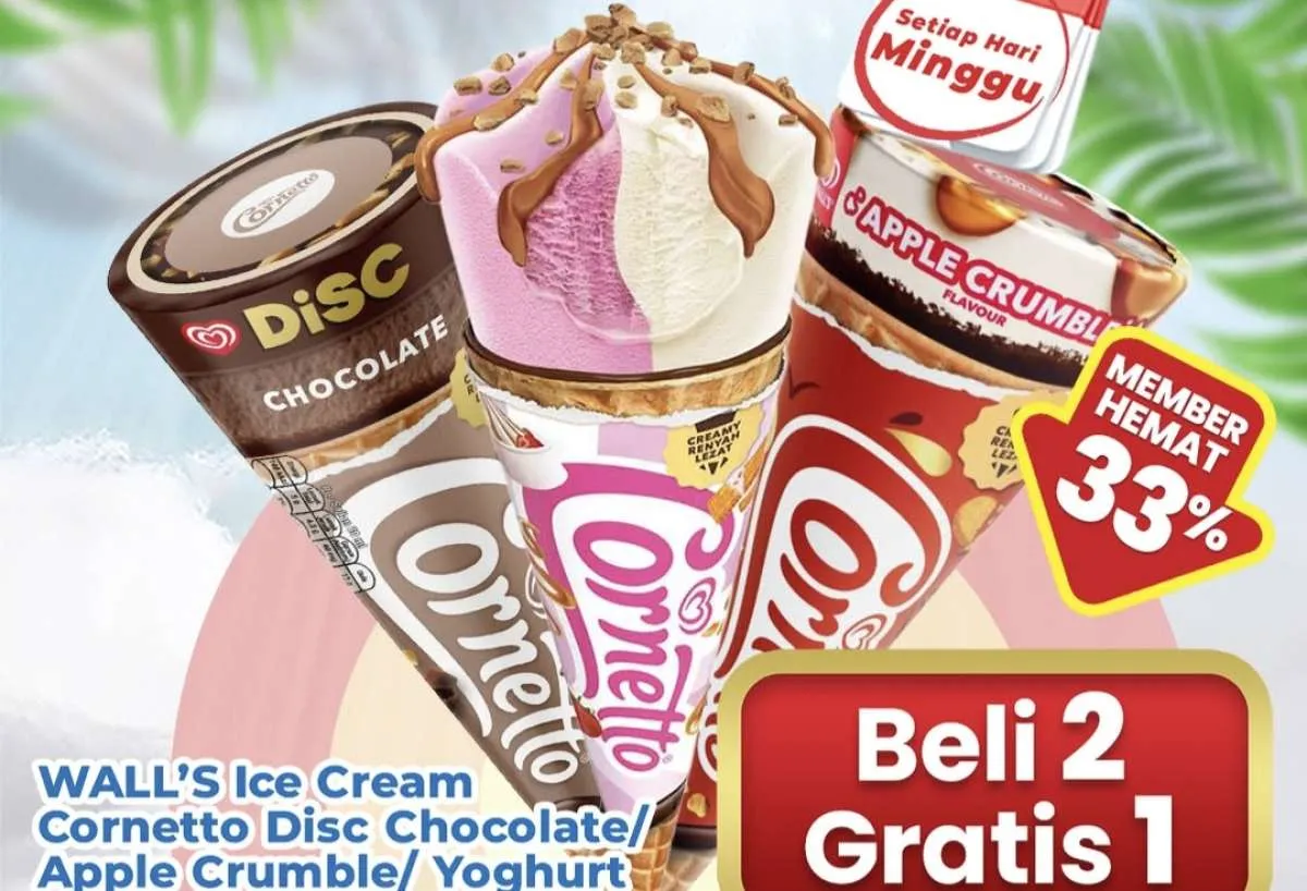 Berlaku 30 November 2025, promo ini menawarkan Beli 2 Gratis 1 untuk pembelian Es Krim Cornetto Disc Chocolate / Apple Crumble / Yoghurt Berry 108ml Pack.
