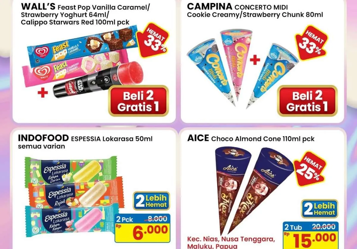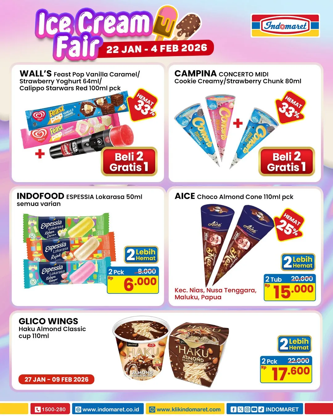 Berlaku selama 22 Januari-4 Februari 2026, promo ini menawarkan berbagai merek es krim Beli 2 Lebih Hemat hingga Beli 2 Gratis 1 untuk pembelian secara langsung di toko Indomaret maupun melalui Klik Indomaret.