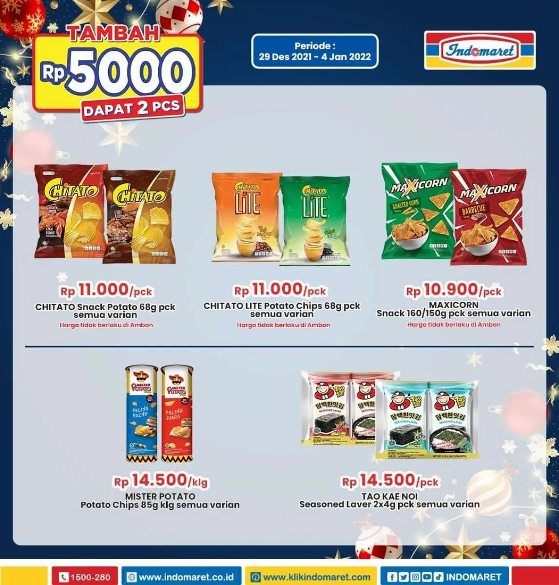 Itulah berbagai merek camilan yang ditawarkan dalam promo Indomaret Tambah Rp5000 Dapat 2 Pcs periode 29 Desember 2021-4 Januari 2022 yang bisa Anda manfaatkan dengan baik.