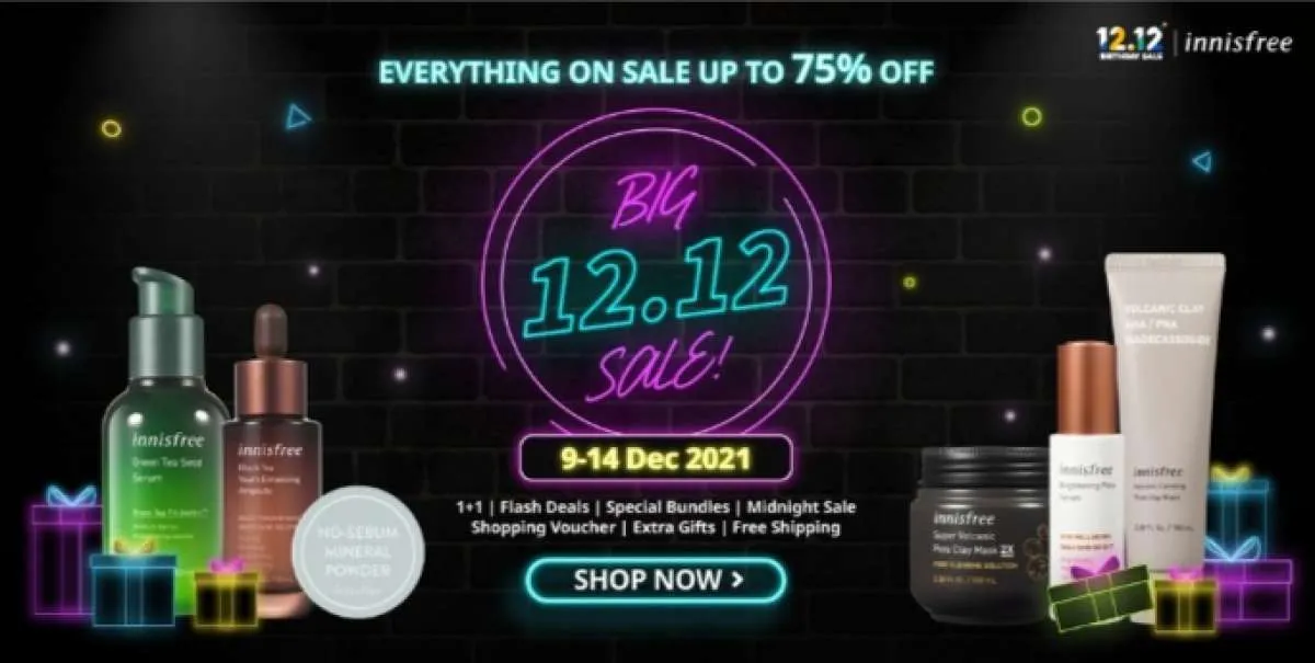 Di Shopee Innisfree Official Shop, sedang ada promo Big 12.12 Sale yang berlangsung 9-14 Desember 2021.