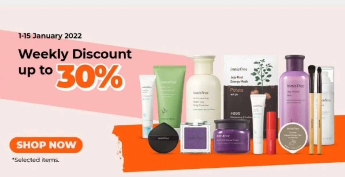 Di Shopee Innisfree Official Shop, sedang ada promo Weekly Discount yang berlangsung hingga tanggal 15 Januari 2022.