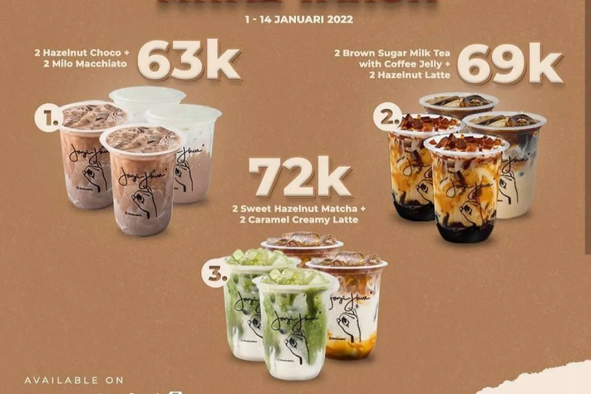 Melansir dari Instagram resmi @kopijanjijiwa, promo yang bertajuk “Serbu hemat Awal Tahun” ini menghadirkan 3 paket pilihan, yang masing-masing paketnya berisi 4 minuman aneka rasa dengan harga yang sangat terjangkau dan pastinya hemat!