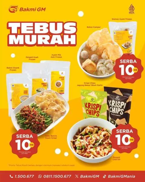 Tak kalah menarik, ada juga promo Tebus Murah dari Bakmi GM dengan beragam menu pilihan serba Rp 10.000 disertai minimal pembelian tertentu.